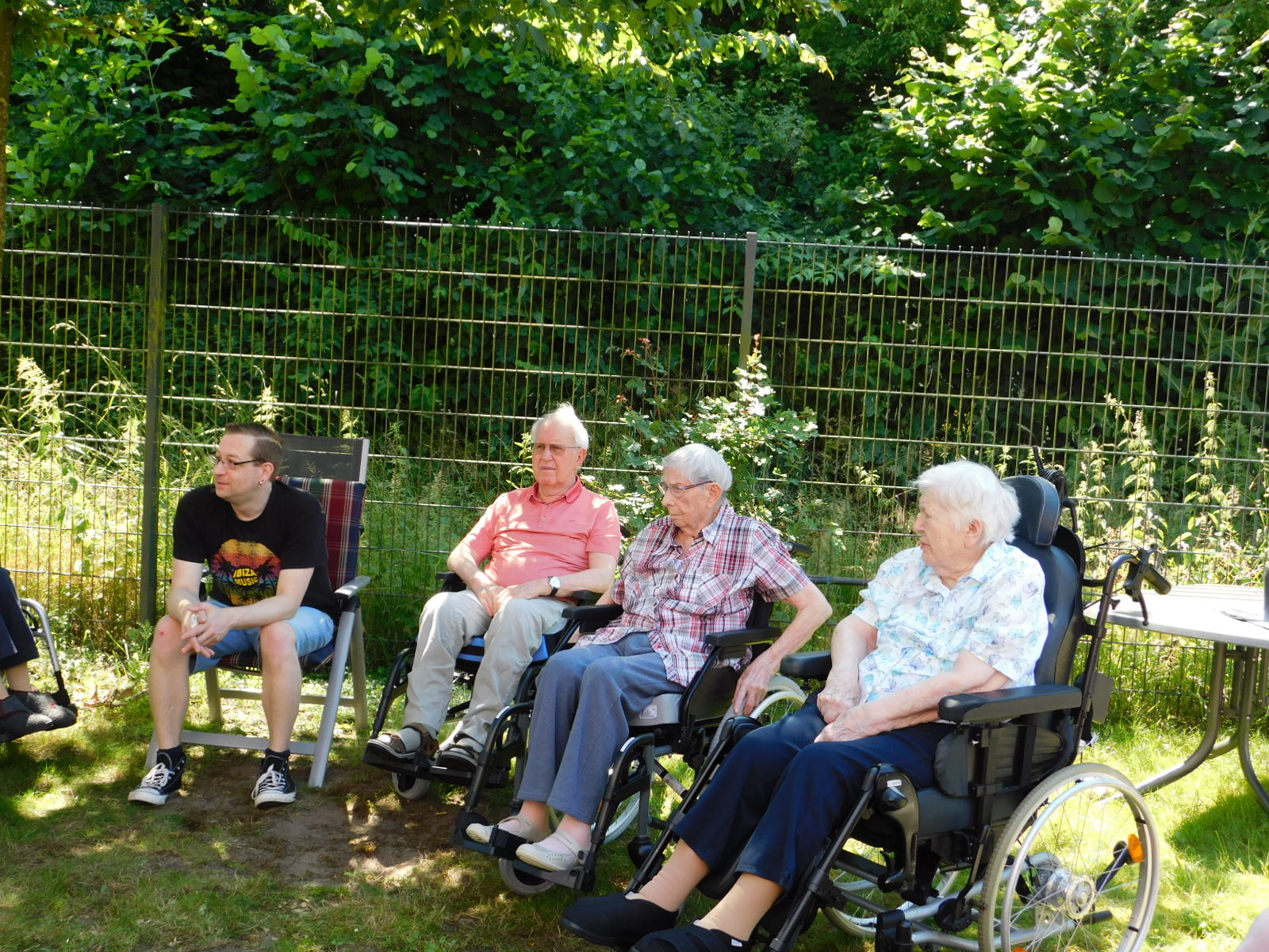 An diesem wunderschönen Tag hielt es uns natürlich auch nicht im Haus, so trafen wir am Nachmittag im Rosengarten auf Besuchshund ''Jette'' von den Maltesern. In schattiger Runde spielte, tollte und entspannte ''Jette'' mit uns, genoss jede Menge Streicheleinheiten oder fläzte sich genüsslich in den Schatten, während unsere Bewohner und Bewohnerinnen einen erfrischenden Saft oder ein Eis genossen.