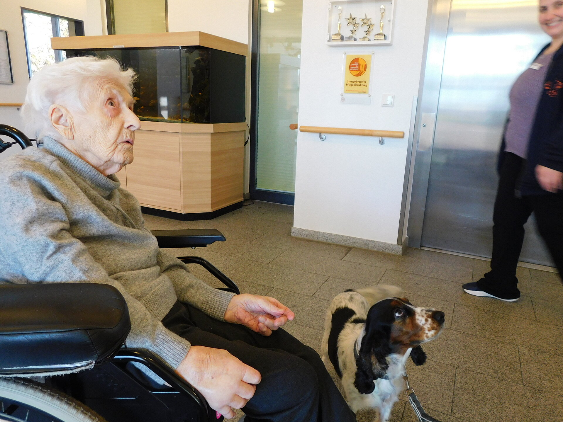 An diesem Montag Vormittag haben wir wieder Besuch von unserem Besuchshund Jette und sein Herrchen. Die Bewohner und Bewohnerinnen holten Jette und seinem Herrchen schon am Eingang ab, um ihn den Weg zu den Bewohner und Bewohnerinnen zu zeigen.Dort angekommen wurde Jette schon herzlich begrüßt und mit Leckerlies versorgt. Jette freute sich auch wie bolle über so viel Liebe und Herzlichkeit. Sie hat versprochen bald wiederzukommen.