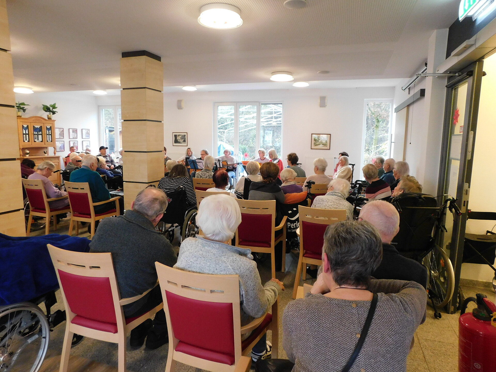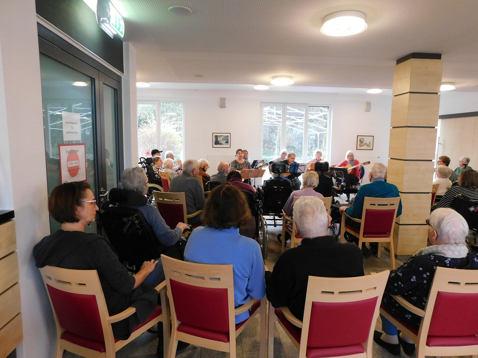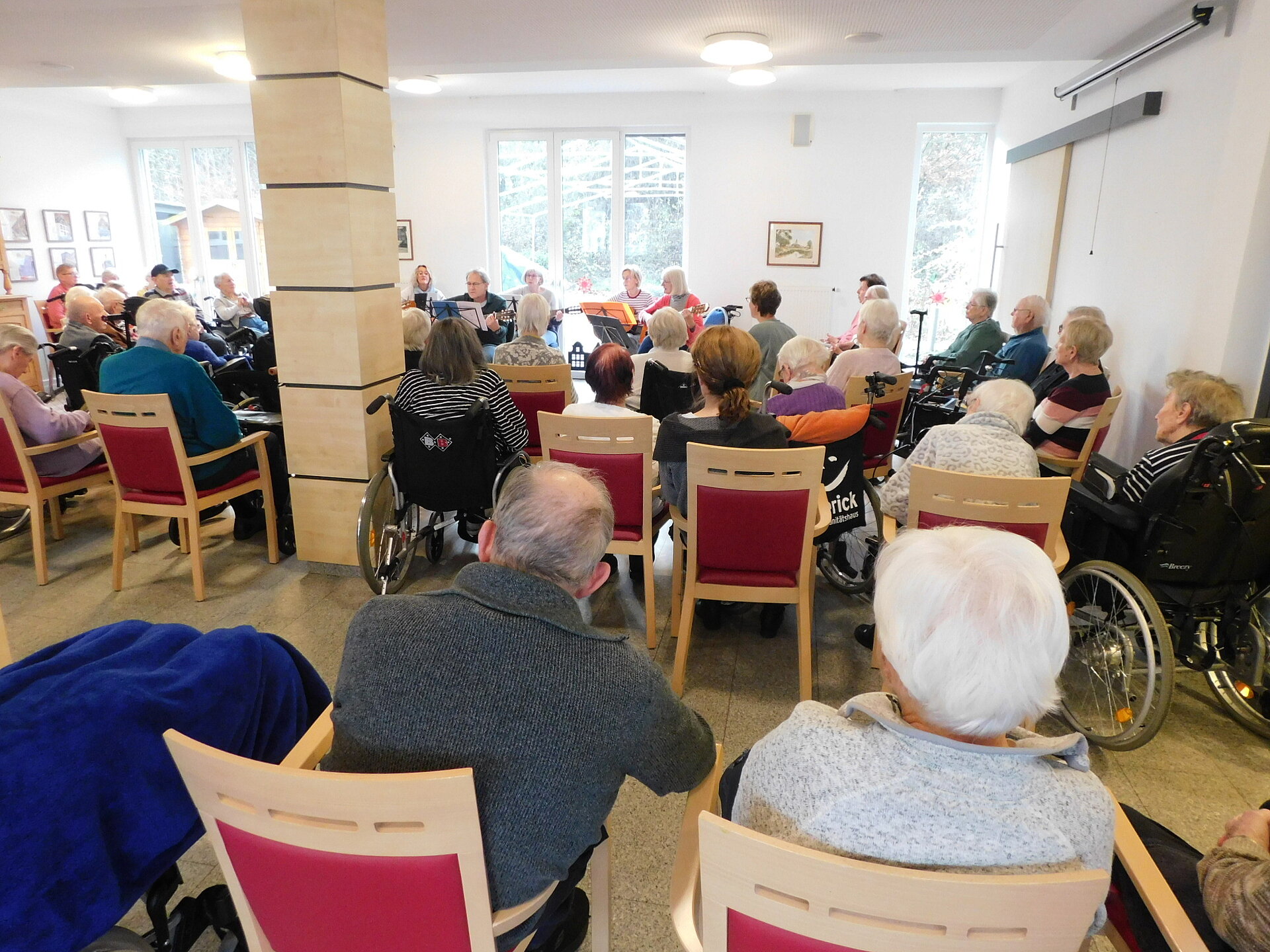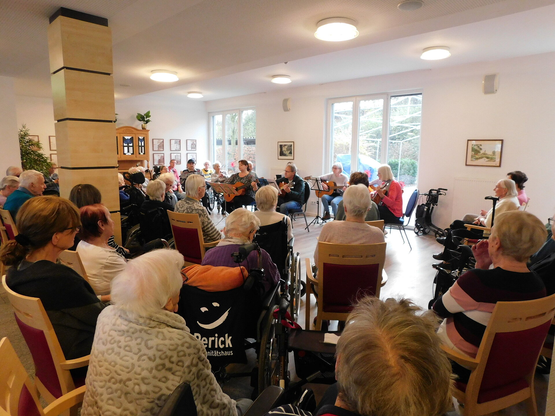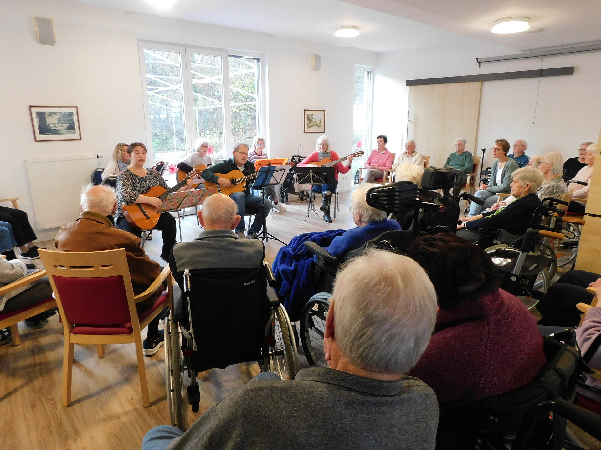 Gemeinsam mit unseren Bewohner und Bewohnerinnen wurden im Bistro wunderschöne Lieder angestimmt-von stimmungsvollen Weihnachtsliedern wie '' Alle Jahre wieder'', '' Oh du fröhliche'' oder auch '' In der Weihnachtsbäckerei'' bis hin zu weniger bekannten Melodien wie '' Was hat der Esel wohl gedacht'' oder '' Wandern durch den weißen Winterwald''.