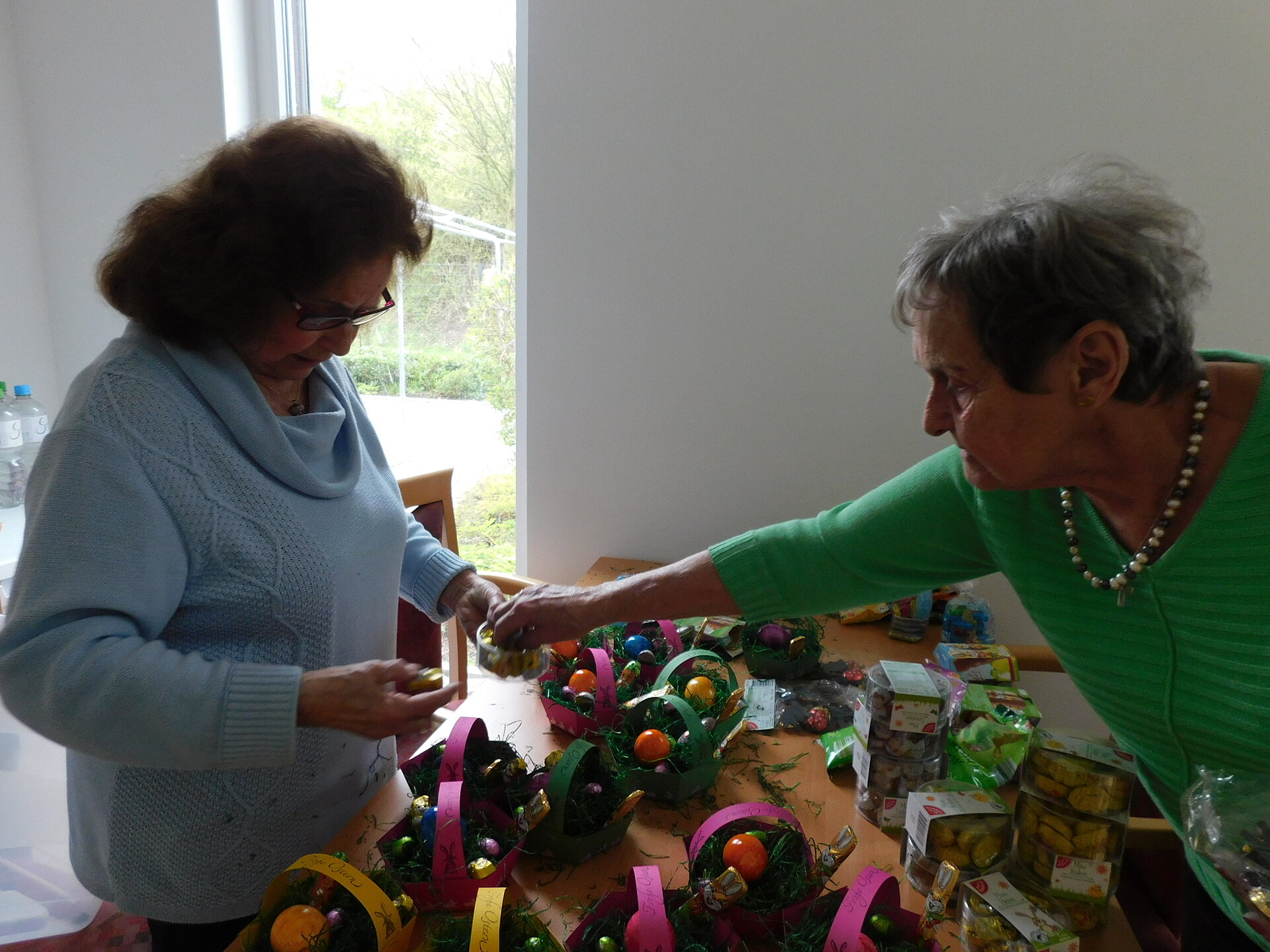 Natürlich wird dabei auch viel gescherzt: „Achtung, da ist ein Ei zu viel drin, das geht als Oster-Mikrofon durch!“, ruft jemand und hält ein glänzendes Schokoladenei in die Luft. Lachen und fröhliches Geplapper erfüllen den Raum, während die Osterkörbchen langsam immer voller und bunter werden.