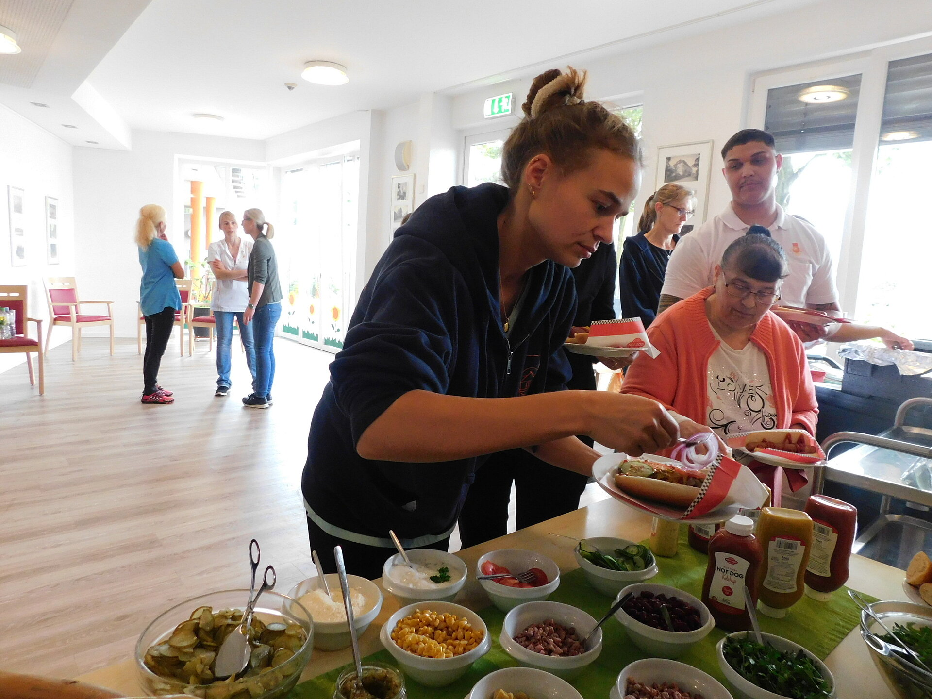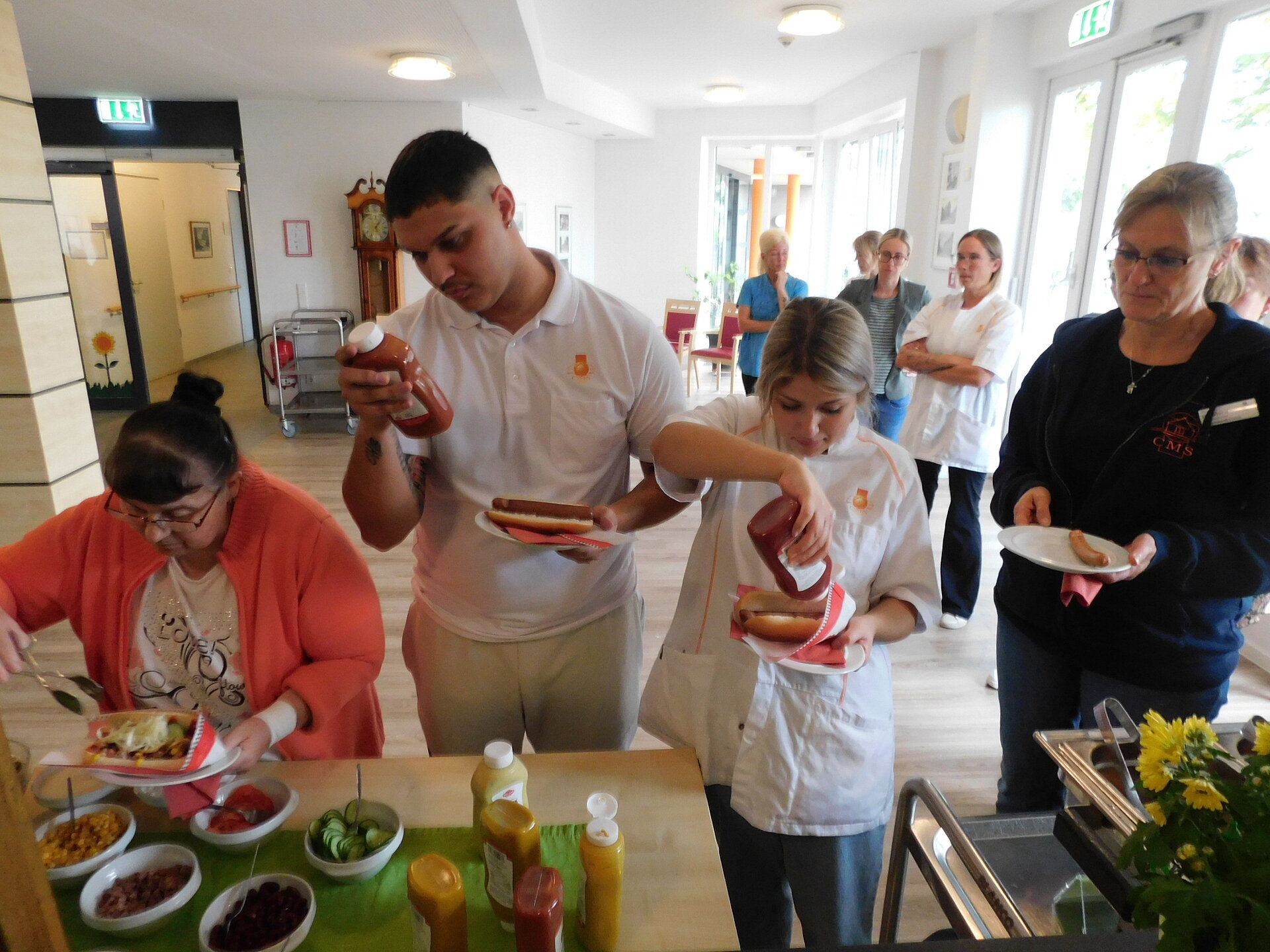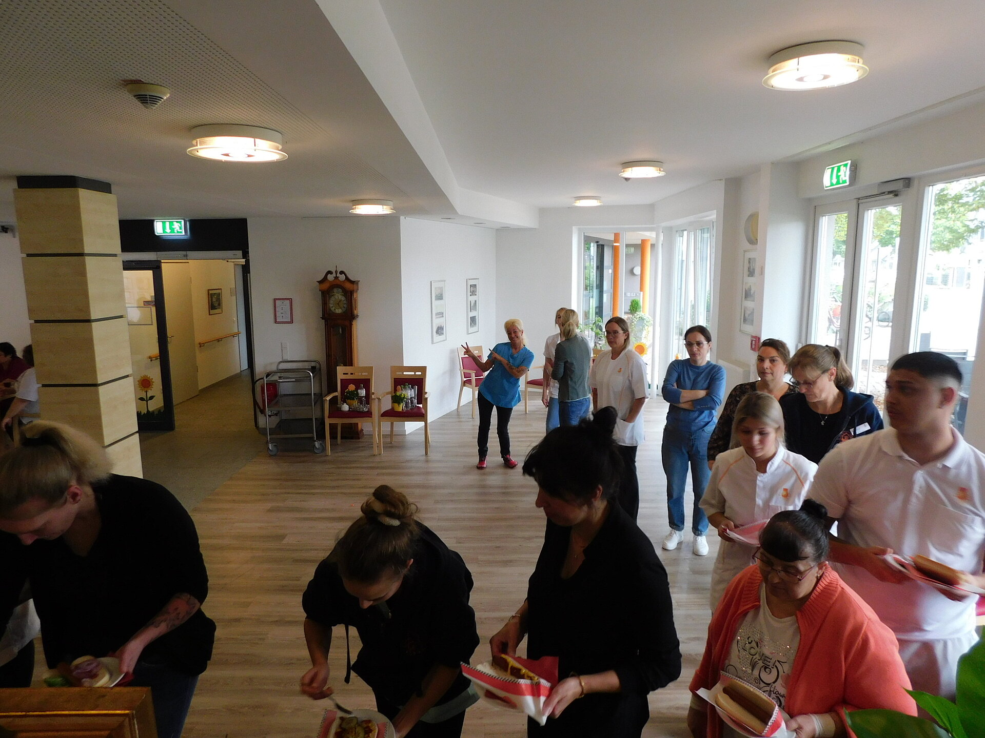 Am frühen Nachmittag ging es zu unserem großen Quartals-Mitarbeiter-Essen. Die Pflege, Sozialer Dienst, Küche und viele mehr kamen zusammen und haben an einem bunten Buffet mit Hotdogs, frischem Gemüse und leckeren Soßen geschlemmt. Dazu wurden Geburtstage nachgeliefert, Urkunden und Zertifikate feierlich übergeben und schöne Geschenke überreicht. Ein ganz besonderer Dank an das tolle Küchenteam für die viele Mühe.