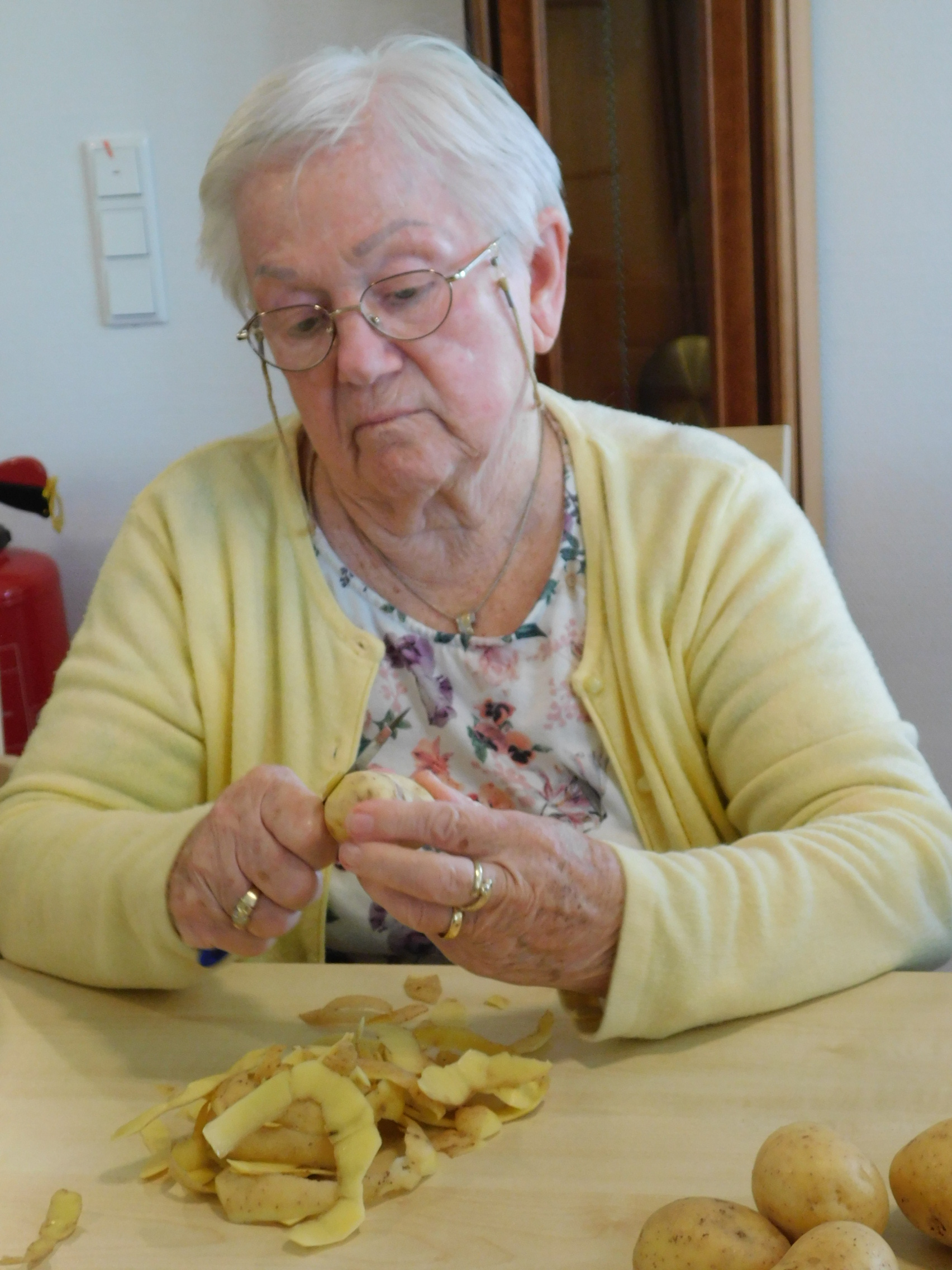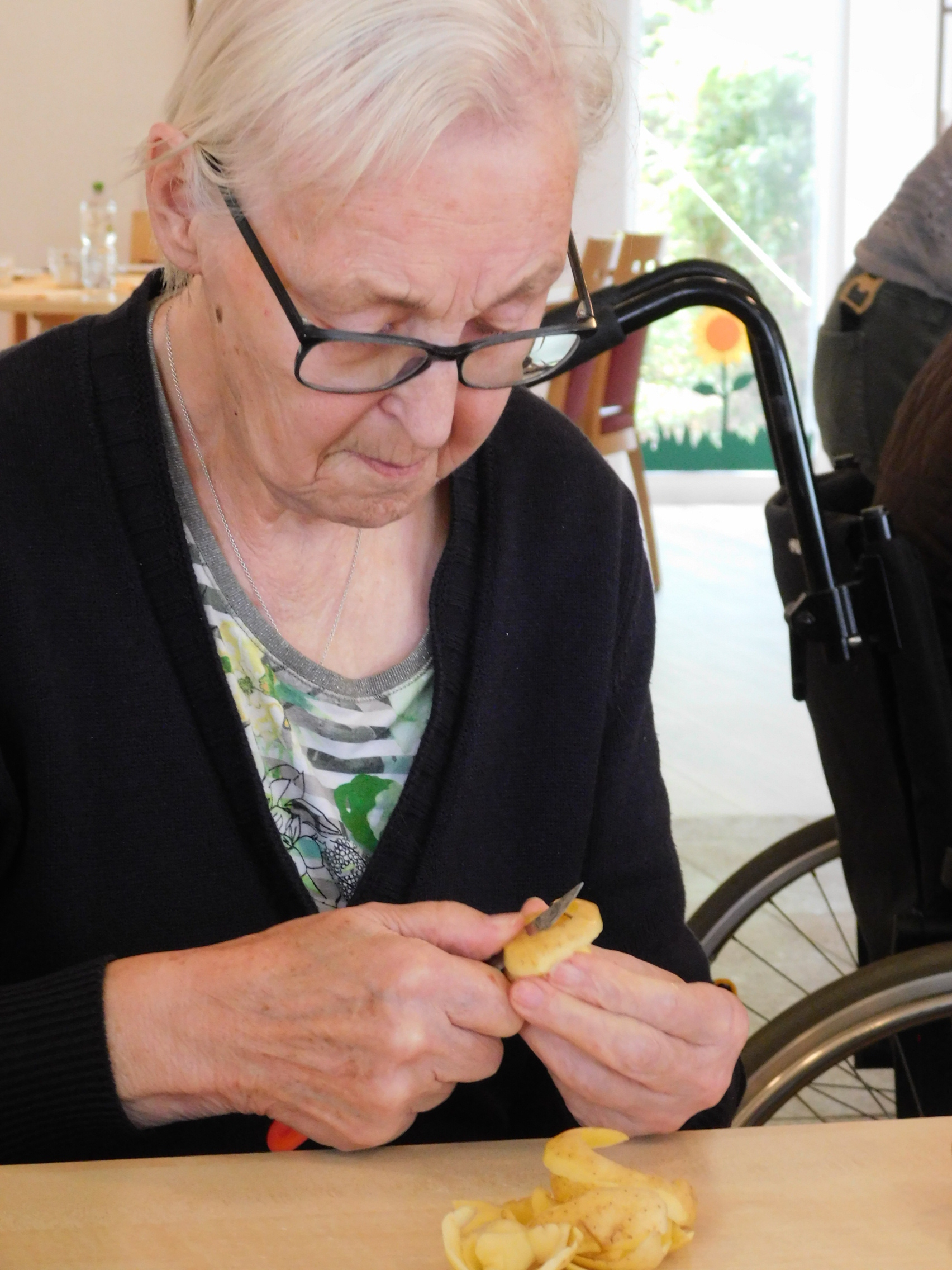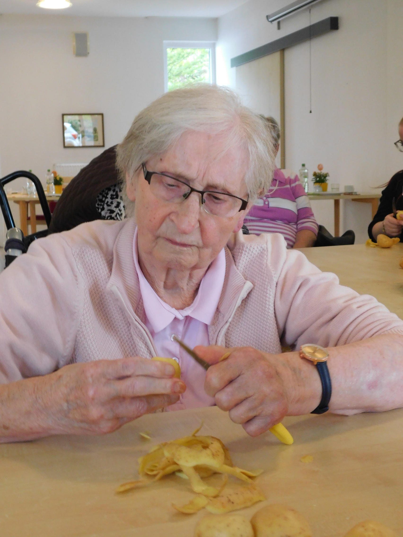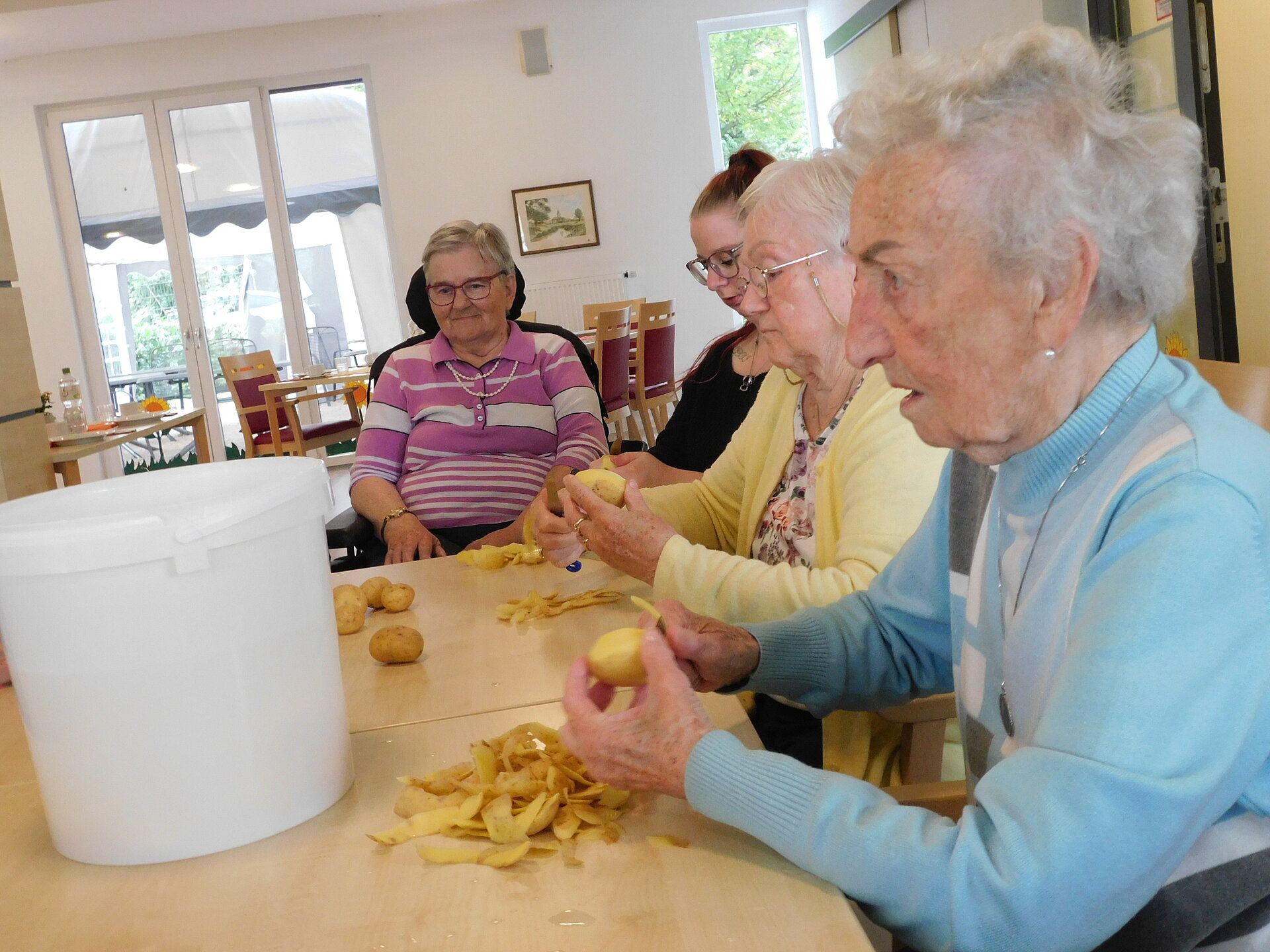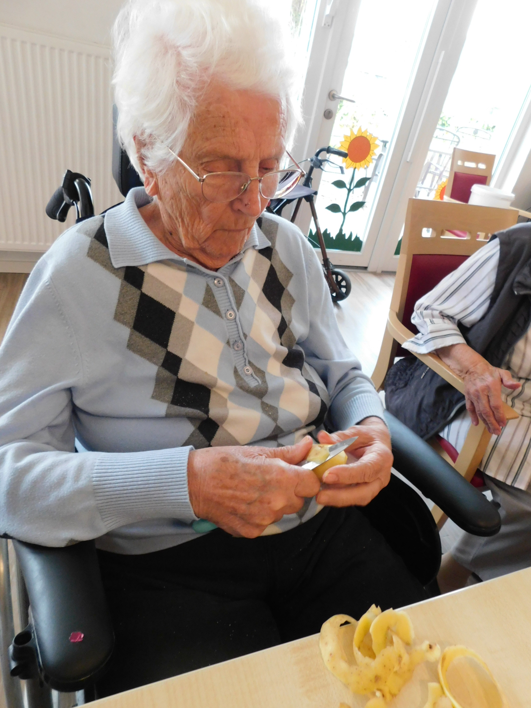 Oh wie lecker können Reibeplätzchen sein, wenn man sie selbst hergestellt hat. Unsere Bewohner und Bewohnerinnen haben sich zum morgentlichen Kartoffelschäl-Wettbewerb getroffen. Mit der sozialen Betreuung ging es zuerst in die Küche zum Kartoffel schälen. In Windeseile und mit sehr viel Genauigkeit wurden die Kartoffeln geschält. Dann wurden die Kartoffeln gerieben und zum guten Schluss gewürzt.