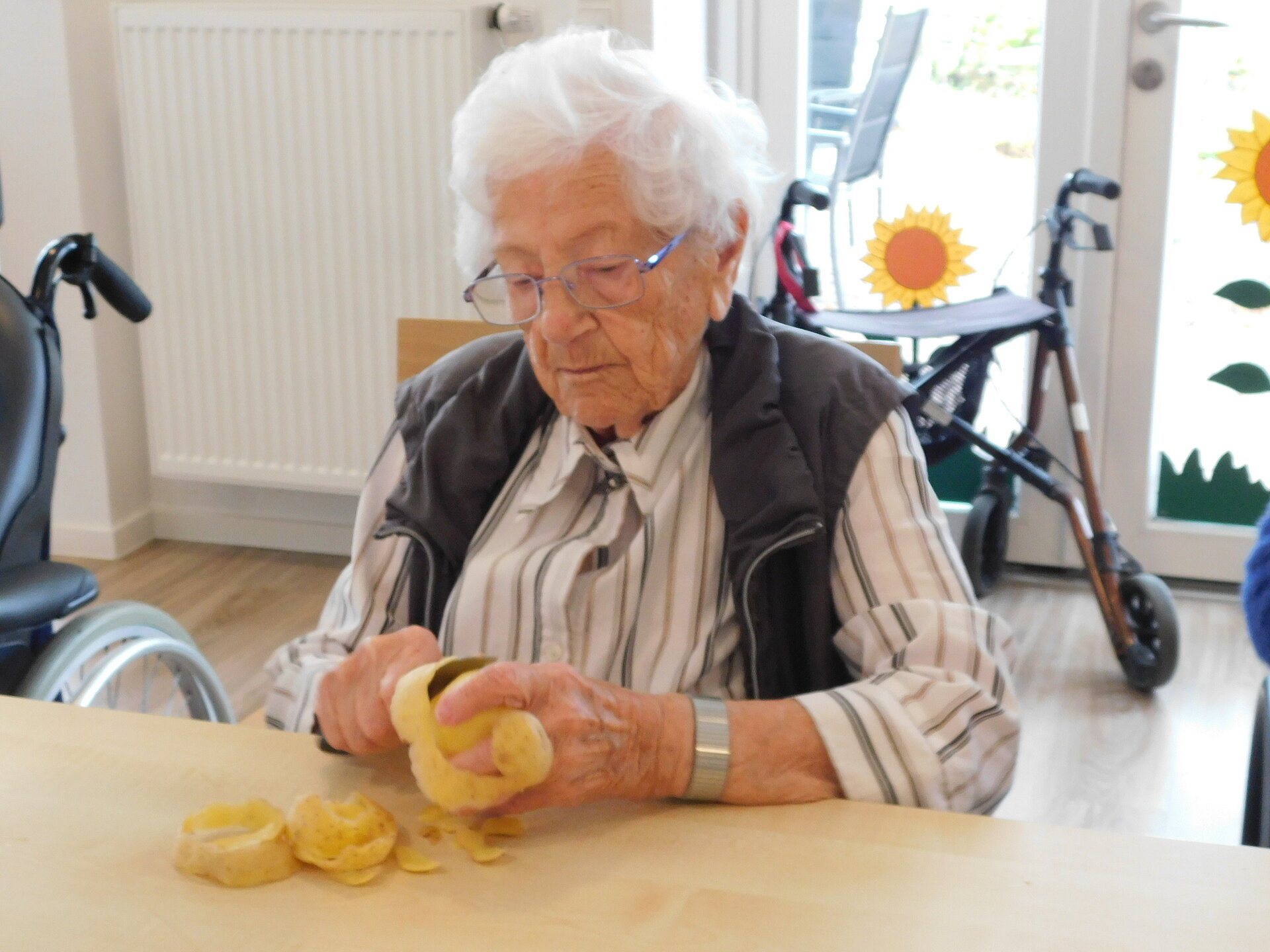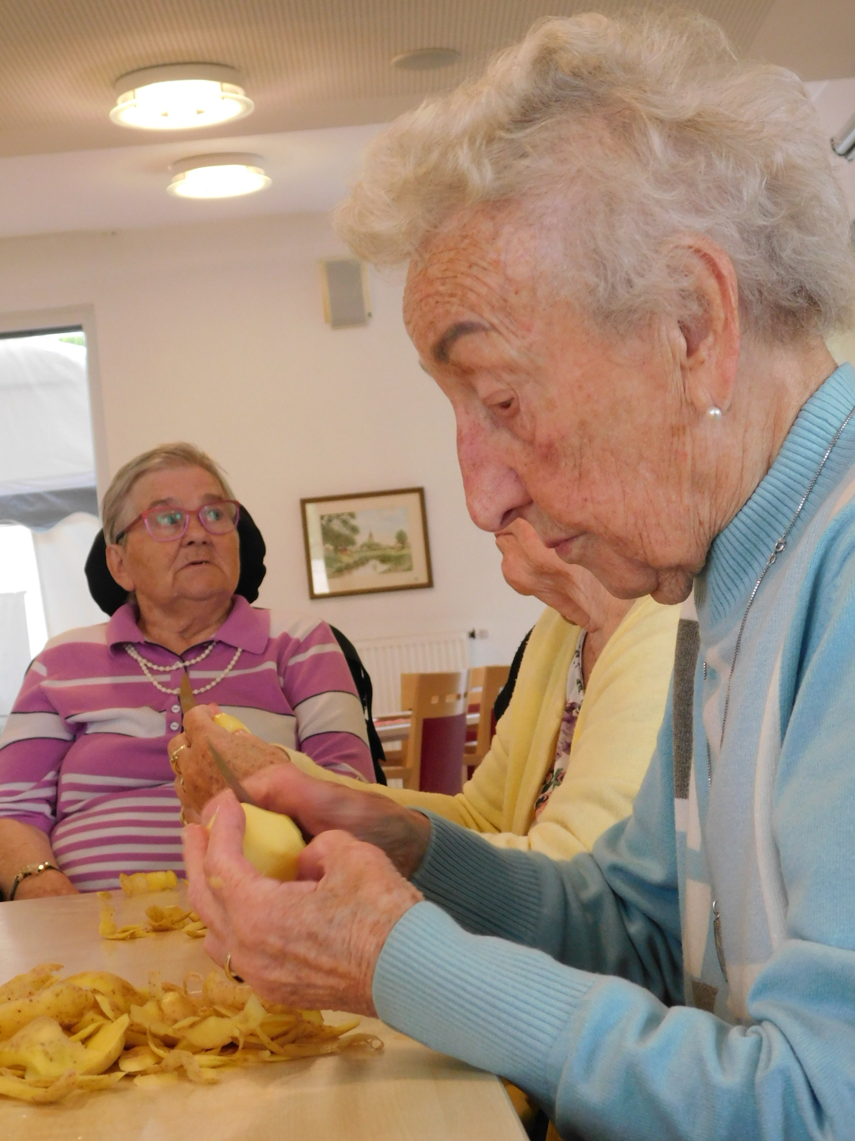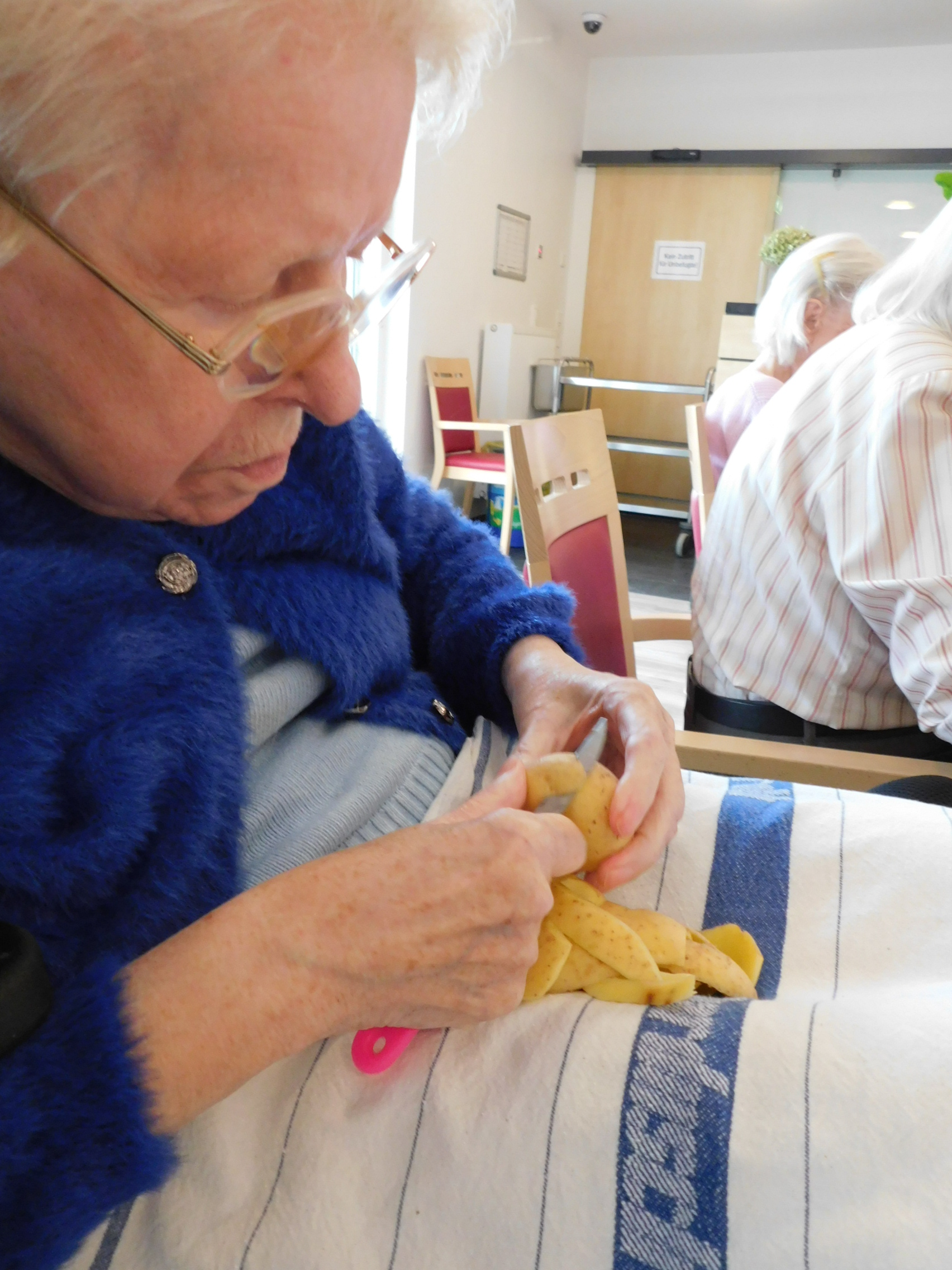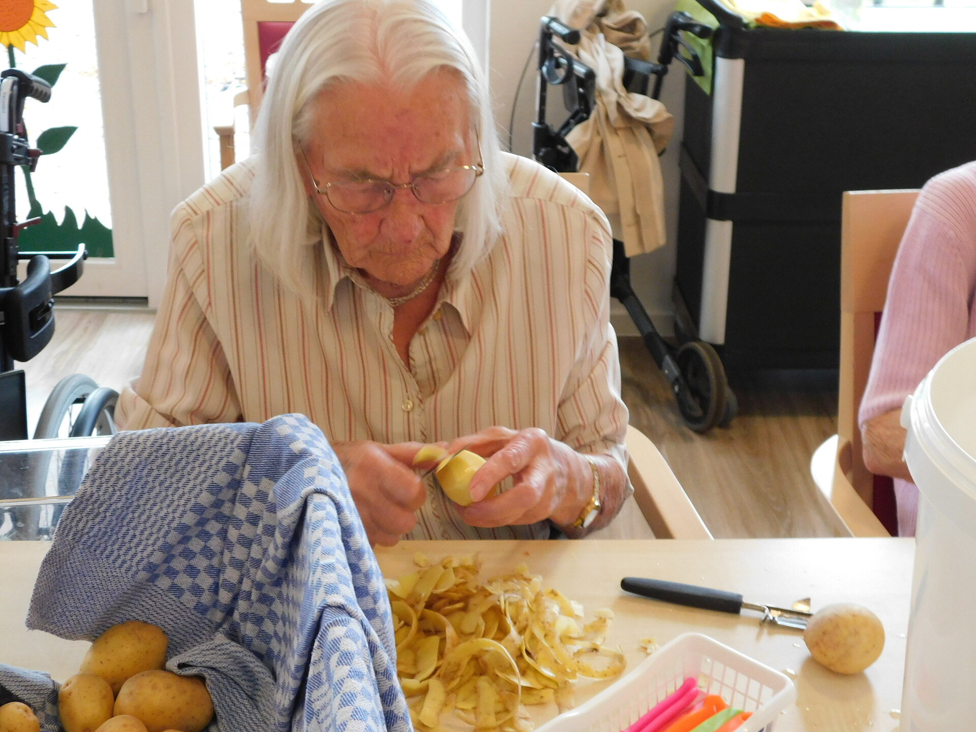 Oh wie lecker können Reibeplätzchen sein, wenn man sie selbst hergestellt hat. Unsere Bewohner und Bewohnerinnen haben sich zum morgentlichen Kartoffelschäl-Wettbewerb getroffen. Mit der sozialen Betreuung ging es zuerst in die Küche zum Kartoffel schälen. In Windeseile und mit sehr viel Genauigkeit wurden die Kartoffeln geschält. Dann wurden die Kartoffeln gerieben und zum guten Schluss gewürzt.