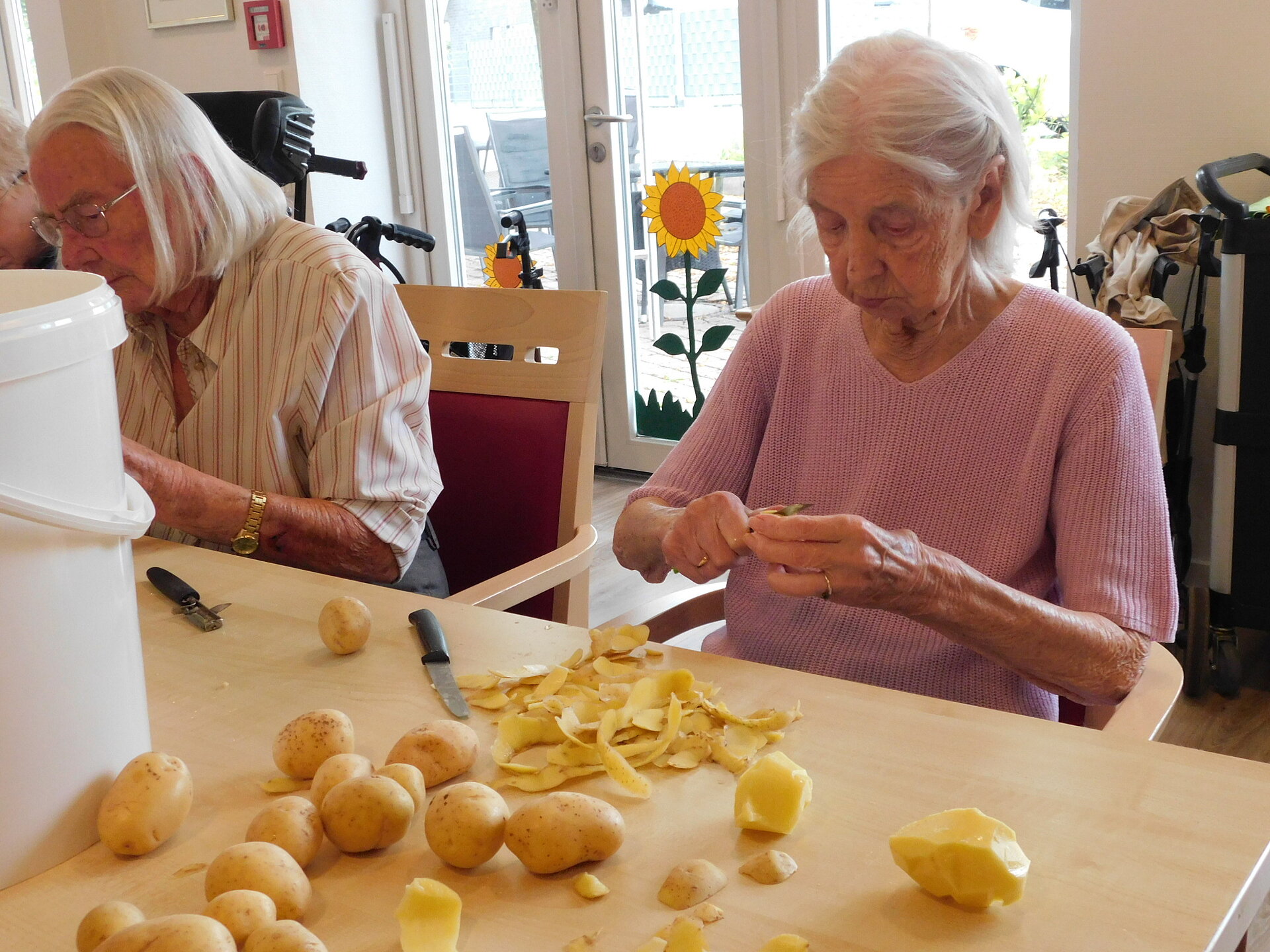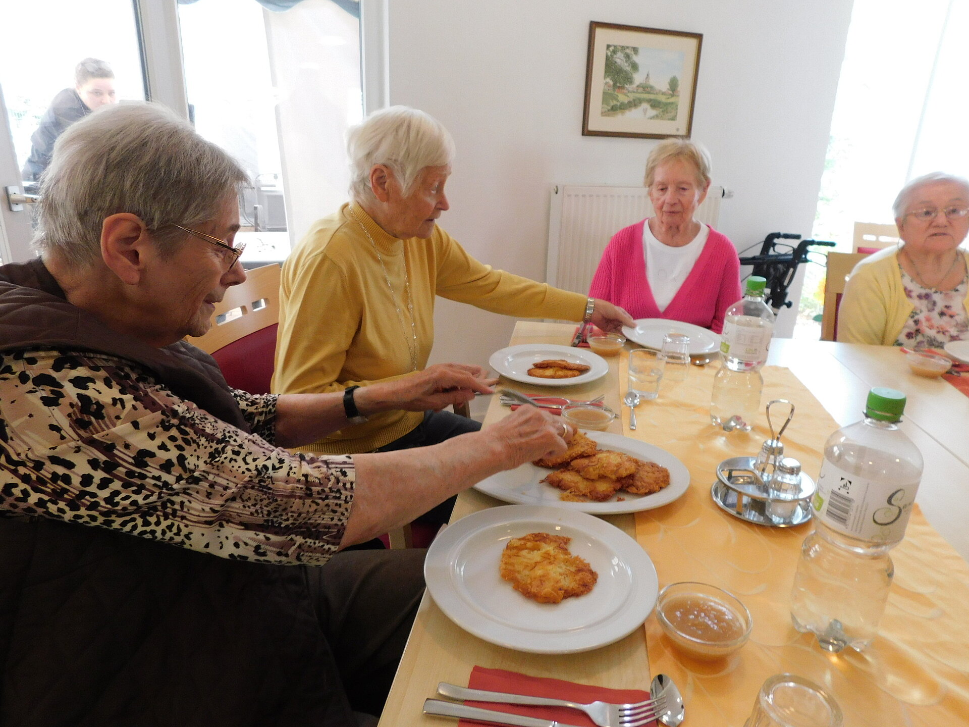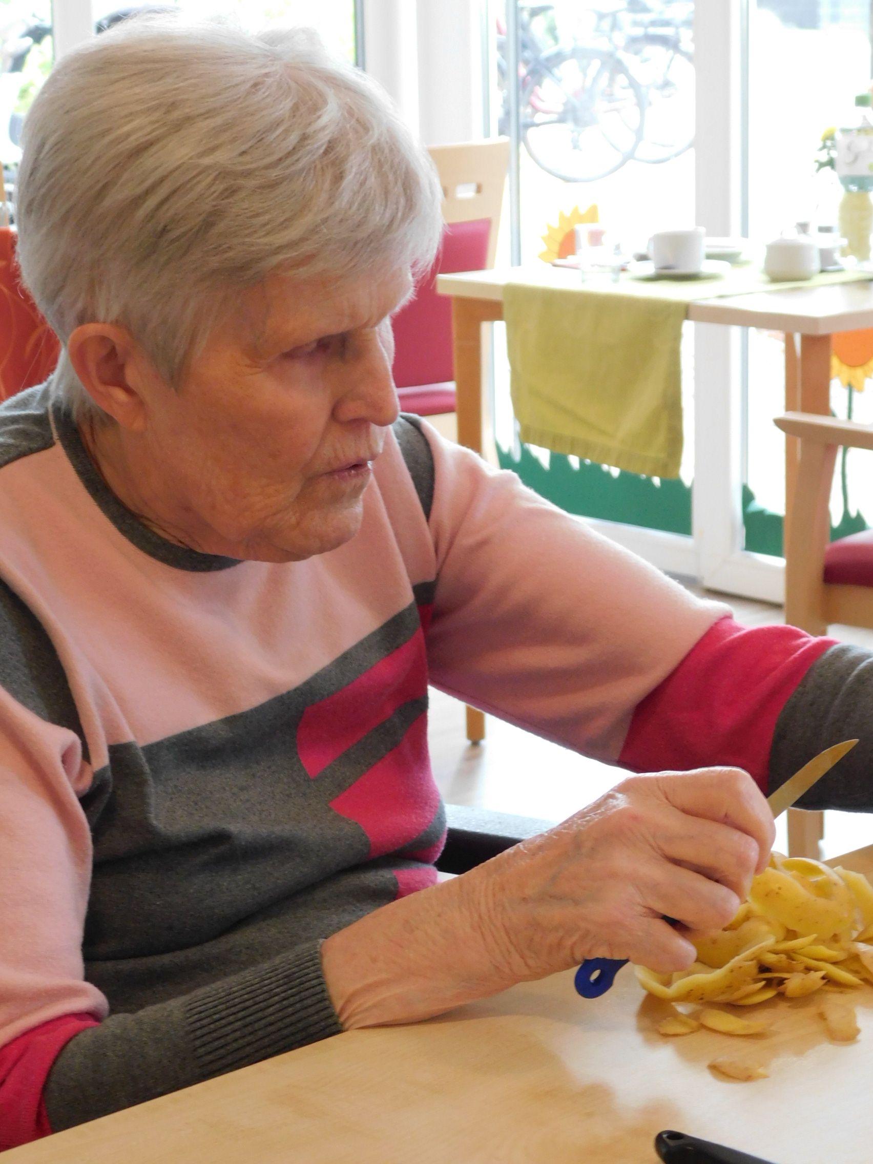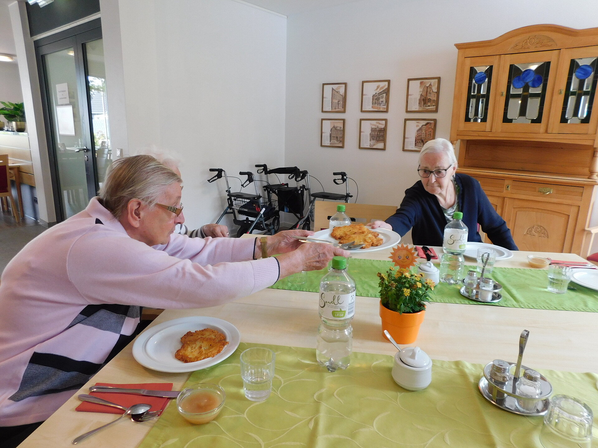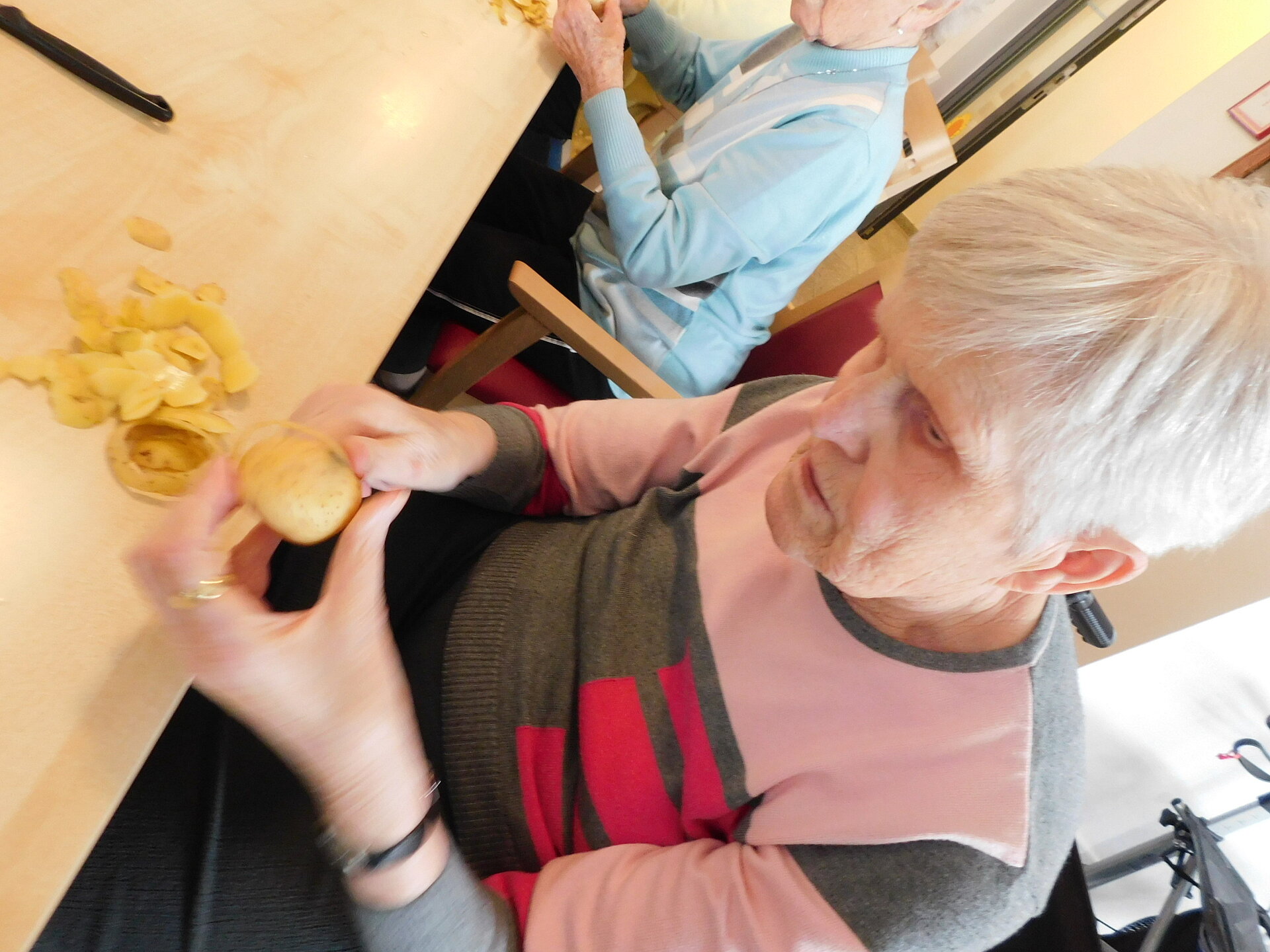 Oh wie lecker können Reibeplätzchen sein, wenn man sie selbst hergestellt hat. Unsere Bewohner und Bewohnerinnen haben sich zum morgentlichen Kartoffelschäl-Wettbewerb getroffen. Mit der sozialen Betreuung ging es zuerst in die Küche zum Kartoffel schälen. In Windeseile und mit sehr viel Genauigkeit wurden die Kartoffeln geschält. Dann wurden die Kartoffeln gerieben und zum guten Schluss gewürzt.